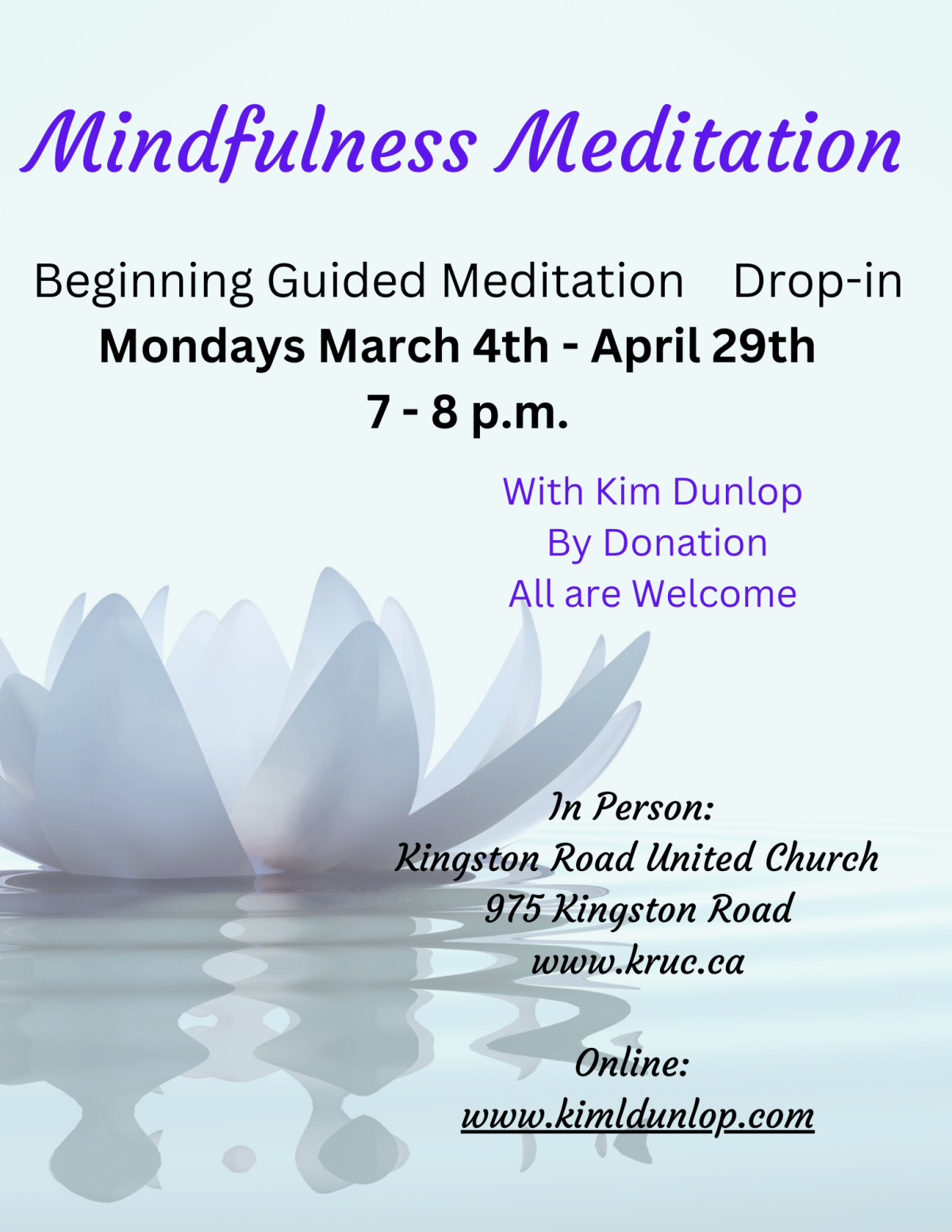 I am excited to share with you my beginning guided mindfulness meditation evenings. These evenings take place in person at Kingston Road United Church, 975 Kingston Road, Toronto. I also offer an online option. These offerings will include gentle movements and different types of guided meditation. Please ensure that if you are attending online, you are in a comfortable, quiet space to enjoy our time together.